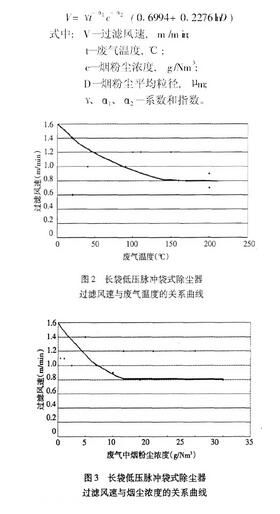 由此可見,脈沖清灰袋式除塵器過濾風(fēng)速與廢氣溫度和廢氣中的煙粉塵濃度成反比,與煙粉塵粒徑的對數(shù)成正比。